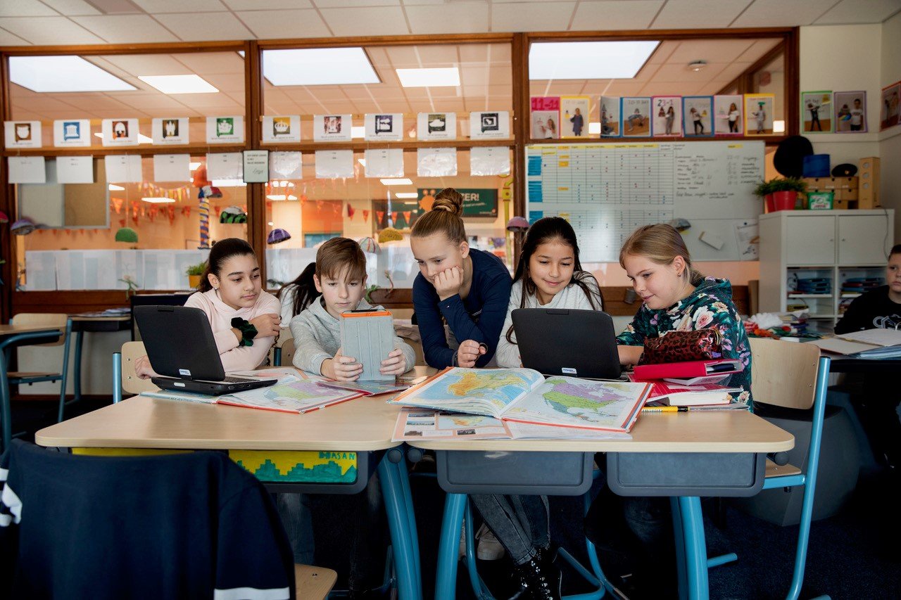 Digitale geletterdheid wordt gekoppeld aan de taalmethode. Bijvoorbeeld door de teksten die ze schrijven, digitaal te verwerken