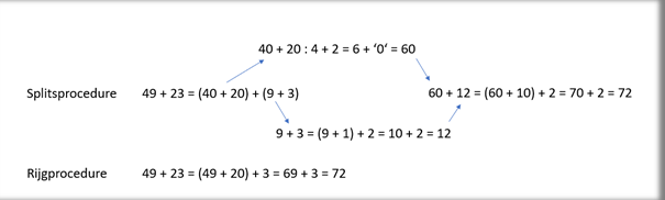 Complexe splitsprocedure. De leerling splitst 49+23 in 40+20 en 9+3. Daarna rekent de leerling 4+2 uit tot 6 en voegt het tiental (de ‘0’) toe en komt tot 60. Vervolgens rekent de leerling 9+3 uit door weer te splitsen: 9+1=10 en 10+2=12. De tussenresultaten 60 en 12 telt de leerling op door nog een keer te splitsen: 60+10=70 en 70+2=72. In totaal zijn dit zeven stappen.